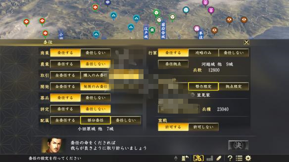所以下一个剧本,就选1582剧本中的北条家,把关东统一了。开局还是全委任,兵发两路打武田和里见,这时候真田和佐竹会去吞并其他小势力,完全没有后顾之忧。灭了武田和里见,等一次收成,大概是9月份,兵粮差不多有五万。带一路兵,总兵力约18000,共九队每队2000.足够灭真田了。