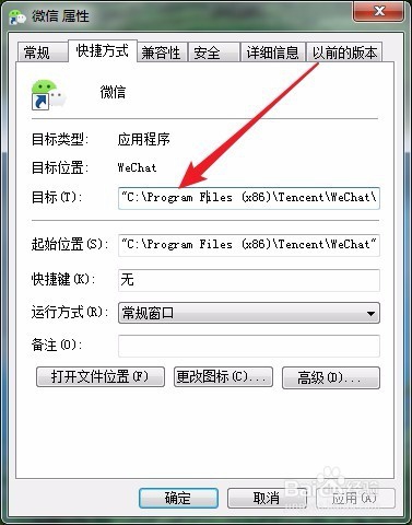 在打开的微信属性窗口中,我们可以看到“目标”一项,把文本框中的内容全部复制下来。