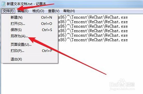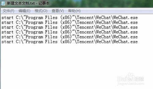 在打开的新建文本文档窗口中,输入start C:\"Program Files (x86)"\Tencent\WeChat\WeChat.exe,需要注意编辑修改的英文状态的双引号,同时想要同时打开几个微信,就复制几行。