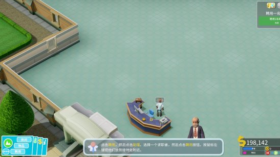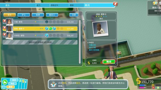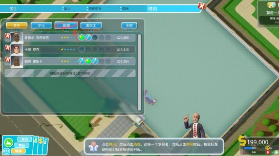 同样,办公室也需要对应的医务人员。点开左下方聘用界面雇佣一位医生将其放置在办公室内。