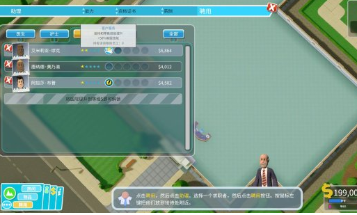 每个工作岗位都需要对应的工作人员,接待处需要助理。点击左下方的“聘用”按钮打开招聘界面选择“助理”一栏。