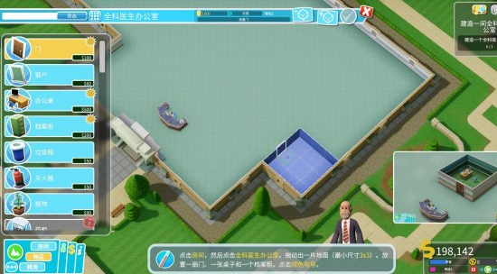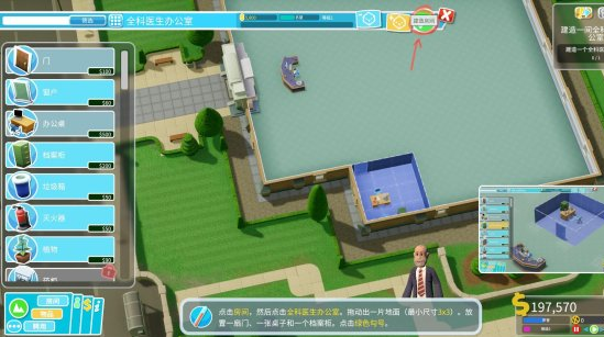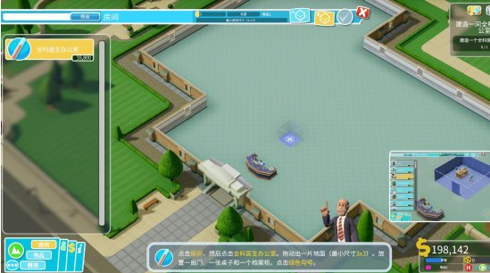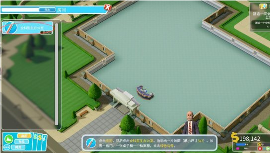 左键点击“全科医生办公室”后按住左键在你期望的位置拖动来选定一块地面来建造办公室。每个房间都有最小尺寸和内置物品的要求,全科医生办公室需要至少3*3的用地、一扇门、一张桌子和一个档案柜。