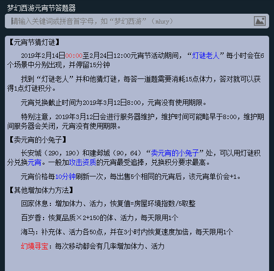 活动开始后,3位灯谜老人每小时会分别出现在傲来国、西梁女国和宝象国,并停留15分钟。找到"灯谜老人"猜灯谜,每答一题需要消耗15点体力,答对就可以获得1点灯谜积分。玩家可以在长安城(290,190)和建邺城(84,70)的NPC"卖元宵的小兔子"处,用灯谜积分选购节日里的特色美食——元宵。