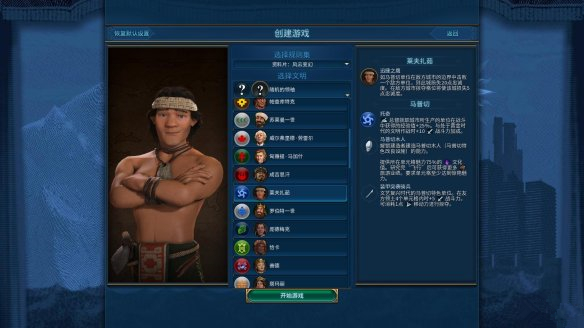 玛那:游戏初始便解锁“航海术”与“造船术”科技,同时拥有进入海洋单元格的能力。上船单位+5战斗力、+2移动力。未改良的树林与雨林提供+1生产力,解锁“保护地球”市政后变为+2.渔船提供+1食物,并向相邻单元格投放文化***。无法收获资源,无获得大作家。