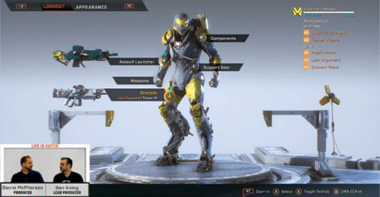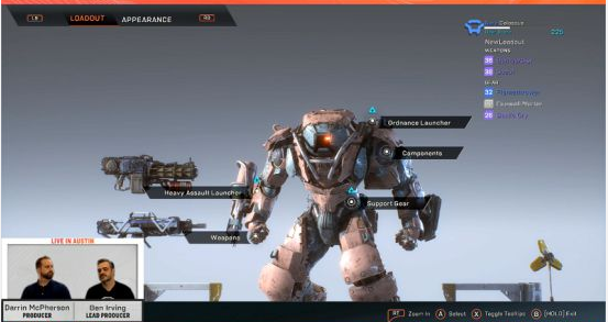 UI界面的左上角显示了Loadout(装备)和Appearance(外观)两个页面。今天主要讲的游戏玩法自然是和装备页相关。而外观的话解说也有介绍是自定义机甲的部分,你可以选择你喜欢的机甲部件外观以及涂装等等来创造属于你自己的个性定制外观。