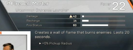 在这里,机甲装备的是叫做火墙迫击炮(Firewall Mortar)的发射器。这是一件白色普通装备。武器细节中则展示了装备属性:火焰伤害42;冷却14;火焰等级60。