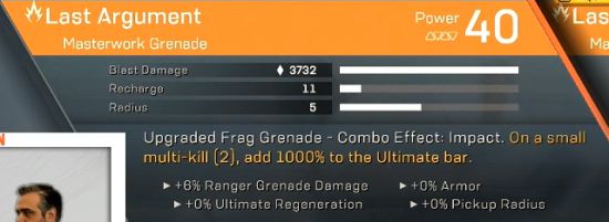 最终争论(Last Argument)大师级手雷:双杀后获得大招10%充能。(显示bug实际为10%)