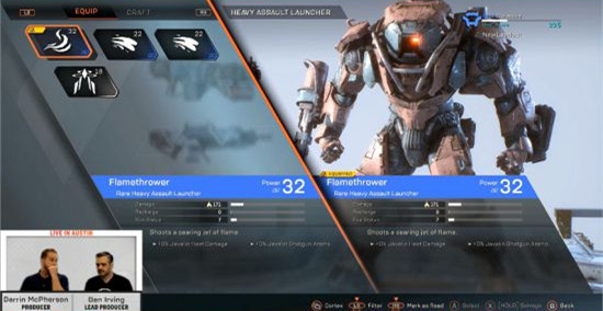 随后,解说切到了武器界面。展示了这一把重型武器:投火者(Flamethrower),蓝色稀有品质,32能量等级。伤害更高,但火焰效果低很多,而作为武器,没有冷却时间。同时在蓝色品质下,副词缀也变成了两条。(机甲热能伤害提高;霰弹枪弹药增加)