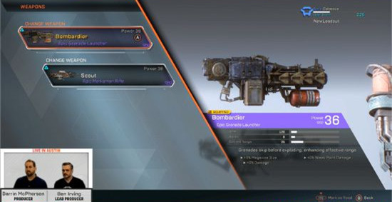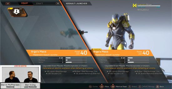 接下来自然进入了装备的解说内容。每个机甲有5个装备部件。分别为重武器,常规武器,(各职业特色)发射器,组件栏以及支援设备。每个部件中可携带的装备都有能量等级和品质区分,而他们的总和决定了你的总等级(譬如演示中的紫色装备以及总分数蓝色225级)。