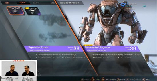 在这段演示中的巨像机甲,使用的是36级紫色史诗级的爆炸专家(Explosives Expert)和超频校准器(Overclocked Regulator)。可以看到都被标注出了巨像职业专用。而装备效果则是针对伤害特性(爆炸,火焰/闪电)的加成。但解说同时也说明这里的装备也包含了其他效果譬如增加飞行/悬浮时间这样的机制增益型,并不仅仅只有加伤害而已。