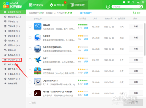 3、然后我们可以在软件卸载界面看不到我们的office2016这个软件的,这里我们就是需要点击最左边的办公软件。