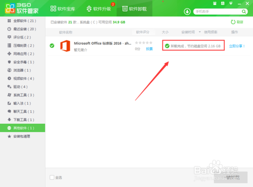 8、最后我们就可以成功的删除掉这个软件了,一般来说,办公软件基本上都比较难删除的,我们使用这种办法删除比较容易的,也不需要去网上下载上面删除软件,所以大家需要删除的可以使用这种办法哟。