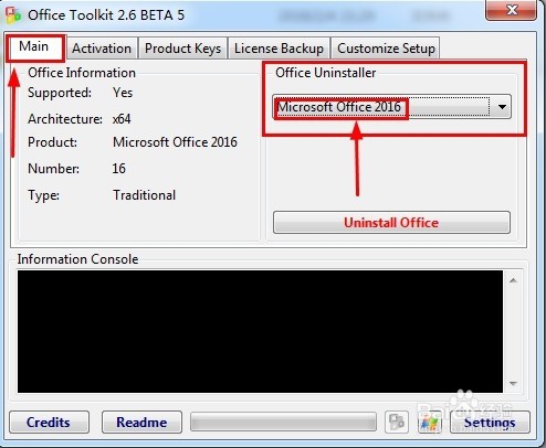 2、进入“Main”选项,然后在“Office Unintstaller”中选择“Microsoft office 2016”