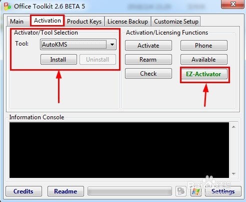 3、然后在“Activation”选项选择“AutoKMS”,然后再选择绿色的“EZ-Activator”激活