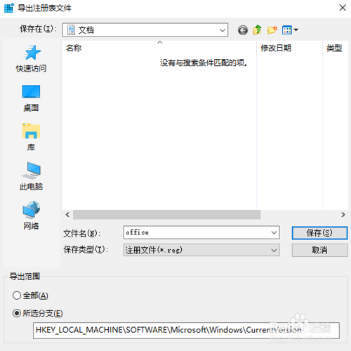 4、在注册表左上角点击“文件”>“导出”,保存当前注册表相关值生成.reg文件。注意选择“所选分支”为导出范围。