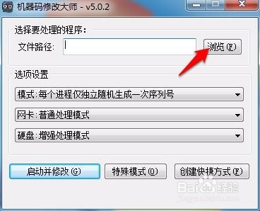 4.打开软件后点击左上角的浏览-选择需要改机器码的软件-选项设置默认(也可以按自己的需求选择)-启用并修改
