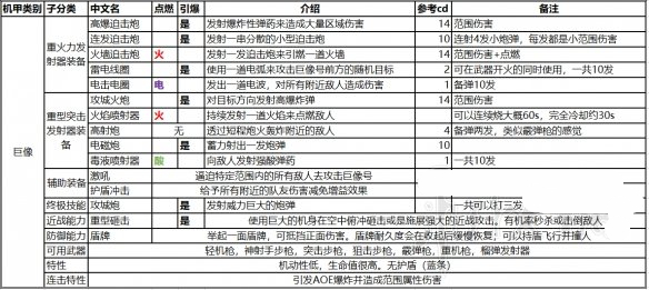 1、机甲能携带至多两把武器。武器是通用的,但是某些种类的武器只能由特定机甲携带。只有巨像能携带重型武器(包括榴弹发射器和重机枪),但是巨像不能携带手枪和冲锋枪。游侠、暴风、截击都可以使用冲锋枪和手枪,但是不能使用重型武器。