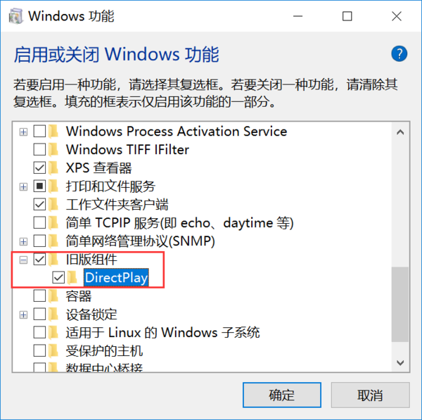 3、在【Windows 功能】窗口展开“旧版组件”,勾选“DirectPlay”点击确定,等待安装完成后按提示重启计算机即可。