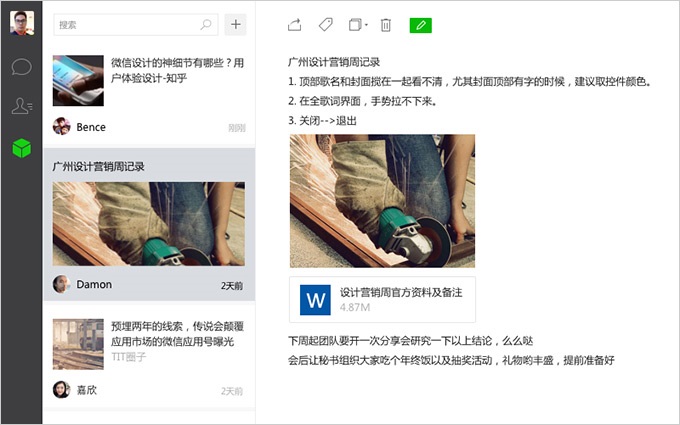 与Mac版微信类似,用户可在一个独立于浏览器的窗口聊天、截图、传文件。直接拖拽、点击浏览都可以向微信朋友、微信群发送文件。