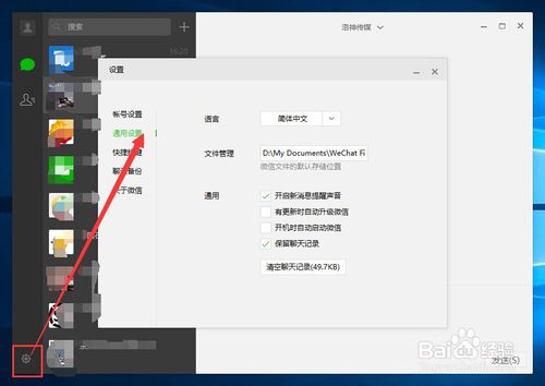 4、点击左侧通用设置,可以设置微信语言、文件存放位置、消息提示音等一些常用操作。