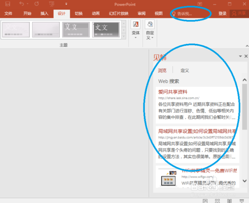 在它的右半上区 你会看到一个搜索框【告诉我您想要做什么】,这就是它的一个新功能-- 智能搜索框,输入共享二字结果如下