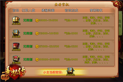 选秀阶段,小主将与NPC考官进行一场战斗,胜利通关则获得官品。如果战斗失败没有通过也可以在一天内多次报名。同样,报名也有官品、玩家等级、铜币和功勋的限制。选秀阶段每天每个品级只录取一定人数,如果官品已经达到录取人数上就不能继续报考。想要到达权利的中心,还是需要耐心与等待的。