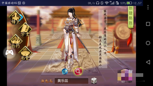 3.当选择完服务器后,即可进行人物角色的创建,无论男女均有侍卫、学士、尚药、尚食4个职业