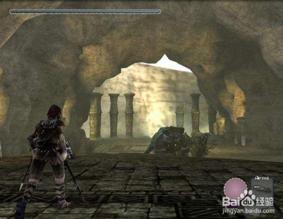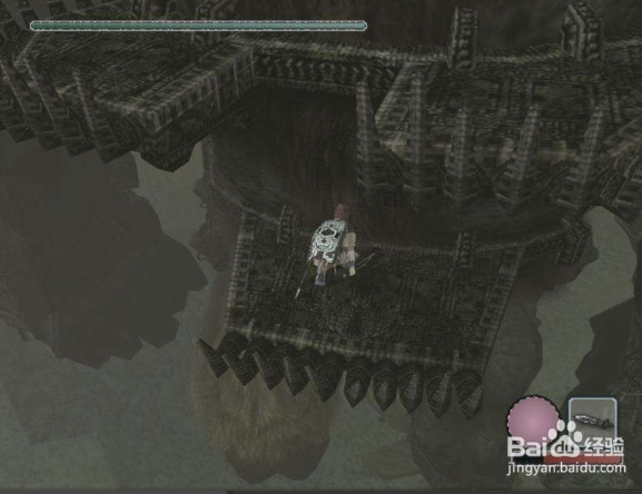 巨像牛头怪,跳到巨像小腿肚子上,刺弱点,巨像下跪。从小腿肚子跳到大腿护甲上,再从大腿护甲一口气爬到腰部小平台上。爬到头顶弱点,等巨像不动时,按一下攻击蓄力,观察右下角耐力槽,一个光圈从中心向外扩散,光圈越大刺入力量也越大,再按一下攻击刺入。