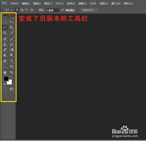 最左边的上方有一个双箭头,点击它以后,PS的主要功能区会回到以前版本的模式,有时候可以对我们的学习提供帮助。