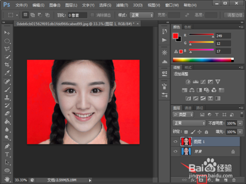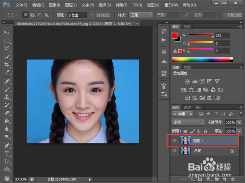 这时候发现头发边的蓝色不见了,但是衣服的颜色有变化,这时候我们给图层1增加蒙版
