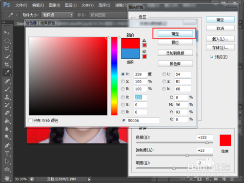 弹出替换颜色对话框,我们用鼠标点击一下图像背景色,也就是蓝色,再点击结果,弹出拾色器窗口,根据实际需要选择合适的背景色,这里我选择的是红色,再点击确定
