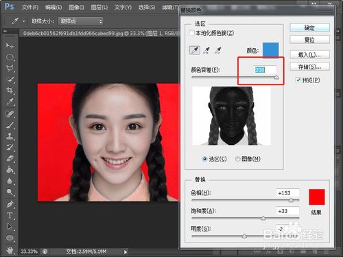 这时候发现图像底色变成了红色,但是头发周边有蓝色的颜色,这里我们将颜色容差调整到最大值200