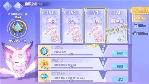 完成成长任务、每日任务、歌舞姬任务可以积攒音乐之心能量,攒满后可以进阶,获得一次性音乐之心宝箱奖励,同时,每次打歌还将获得金钱或得分buff加成
