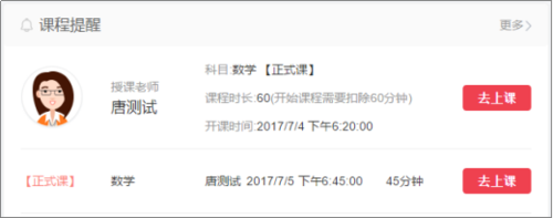 1.从首页直接进入。首页的课程提醒版块会显示所有已排的课程,点击“去上课”即可进入该节课的课堂