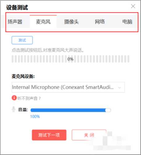 2.设备测试在您首次上课前会自动弹出,测试项包括扬声器、麦克风等5项,请按照页面提示依次完成所有项的测试,测试结果均没有异常,即可正常上课。