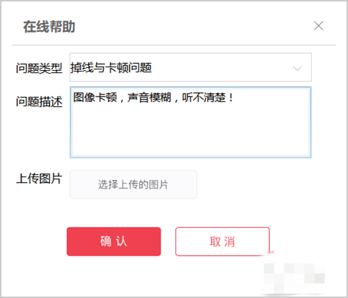 2.点击“在线帮助”即弹出问题编辑框,依次选择问题类型、输入问题描述,如有必要还可以上传问题界面的图片,最后点击“确认”即可提交申请,技术支持人员会在接到申请的第一时间与您联系,帮您处理您所遇到的问题。
