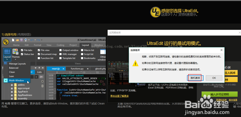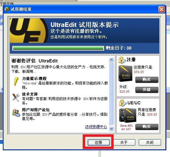 打开UltraEdit,未激活会提示为试用版本,需进行激活,点击【注册】进行激活;