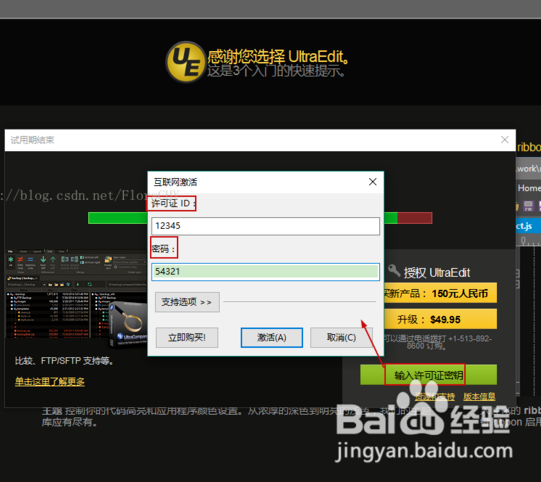 在弹出的窗口中,许可证ID填写【12345】、密码填写【12345】,并记录【用户码1、用户码2】;