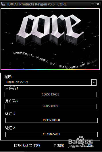下载并打开破解机文件【keygen.exe】,程序 选择【UltraEdit v23.x】”,将步骤4中的【用户码1、用户码2】分别复制到破解机的【用户码 1、用户码】,点击【生成】,生成【验证1、验证2】;