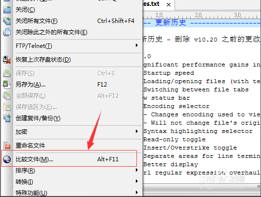点击右上角的菜单中之后,弹出了下拉菜单中,进行选中为“比较文件”的选项菜单。