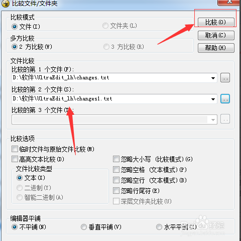 然后在文件输入显示文件的路径之后,进行点击菜单中的“比较”的按钮。然后就会对比的文件,显示不同之处。