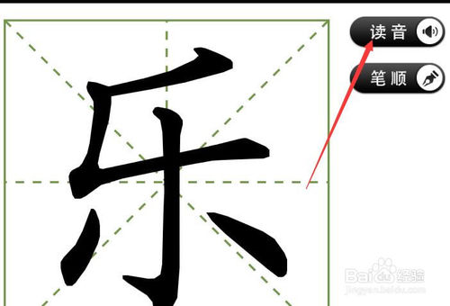5.写好所有生字后,就可以开始教认字了。单击一个字,屏幕就只放大显示这个字,旁边有读音和笔顺两个按钮。单击读音按钮。