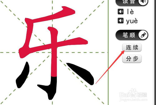 7.接下来是学习写法。单击笔顺按钮,出现连续和分步两个按钮。点连续一气呵成一下子写完,过程是动画显示。