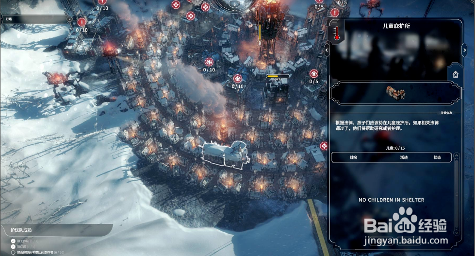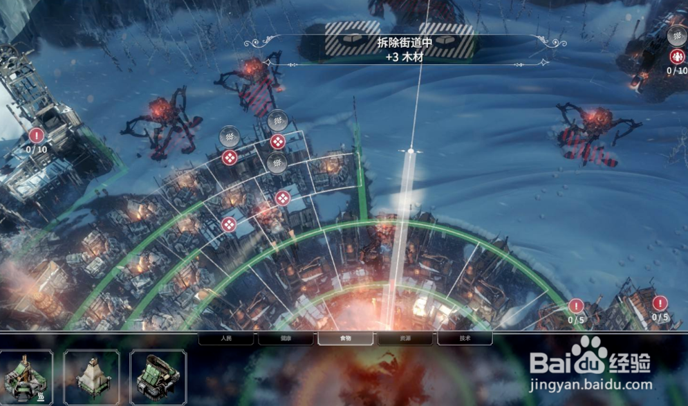 7.关注天气条的第一次降温时间,在第一次降温前的晚上想好接下来要采的露天资源种类,提前在需要的地方修采集站。第一次降温后尽量保证儿童和工程师不要在露天工作,否则极易生病。工人虽然皮糙肉厚,但是除非急缺,否则也不要让工人去寒冷的露天采集。