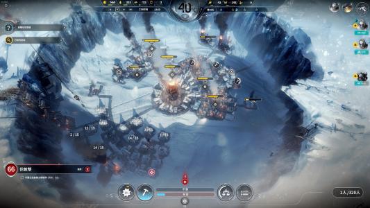 资源方面只点了各种资源建筑,一级的采煤机、满级煤矿、一级锯木厂、二级钢厂、二级冰墙钻机,衣食住只点了一点猎人装备,食物来源全靠普通的猎人小屋,缺人手的时候不得不操作一下,白天上班晚上打猎,钢厂只建了一个二级的,没建两个是因为第二个的位置没被我的蒸汽枢纽扩进去。后来又建了一个蒸汽枢纽,但是也不怎么缺钢了。