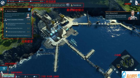 在画面左上方会出现一个面板提示玩家当前需要达成的目标,比如此时的目标是:生产饮用水;达成200人口、建造通讯设施。
