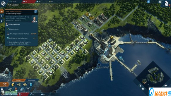 点击建造图标后会弹出一列图标,一开始可以看到有Workers和Oraments的分支选项,前者对应生产设施,后期则对应装饰。