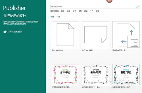 一、利用Publisher为自己设计名片启动Publisher2016,进入如下图所示的界面。