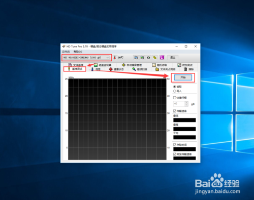 4.安装完成后,启动硬盘检测软件,先选择我们的电脑的硬盘,再选择基准测试,点击右侧的开始后,耐心等待一会时间。