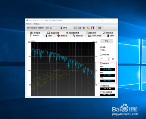 1、如果买了一个新的硬盘可以通过基准功能测试一下硬盘的读写速度,读写测试是单选的请注意选择。值得注意看的是最低的速度和最高的速度
